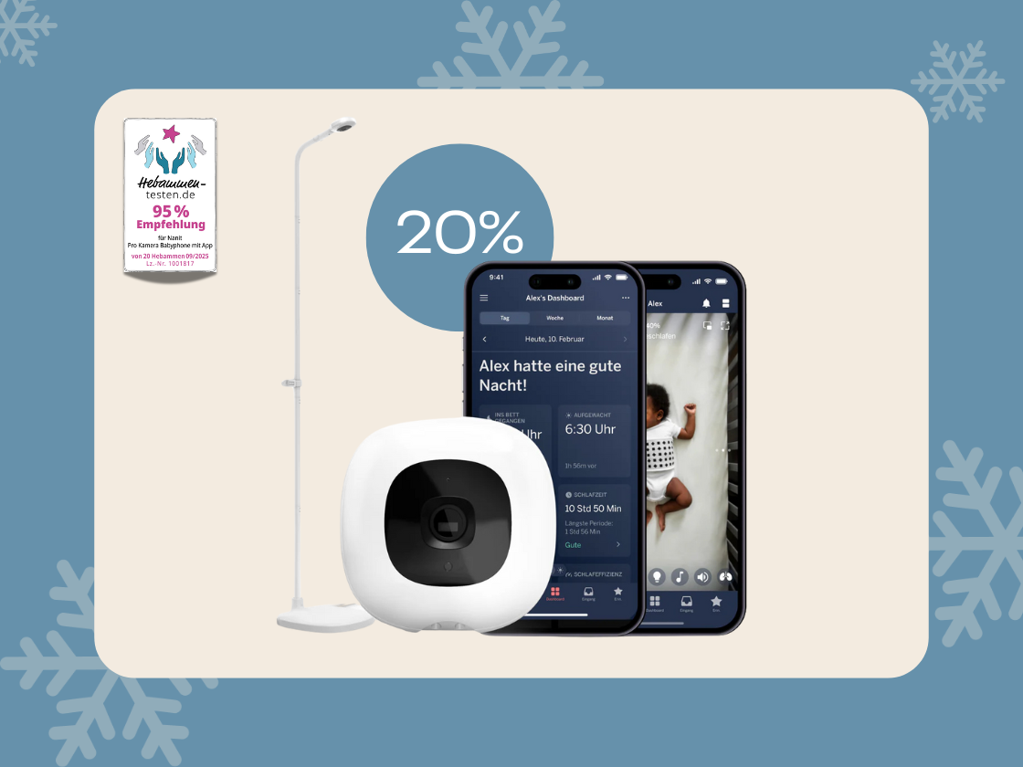 Nach dem Kauf des Nanit Pro Kamera-Babyphones kannst du optional ein Nanit Insights-Abo abschließen. Der Preis hängt davon ab, welches Paket du wählst. Gut zu wissen: Bei jedem Kauf ist ein kostenloses Insights-Probeabo inklusive. Auch ohne Abo bietet Nanit viele smarte Funktionen – darunter Live-Video über die Babyphone-App, Echtzeit-Benachrichtigungen und Atembewegungsüberwachung.